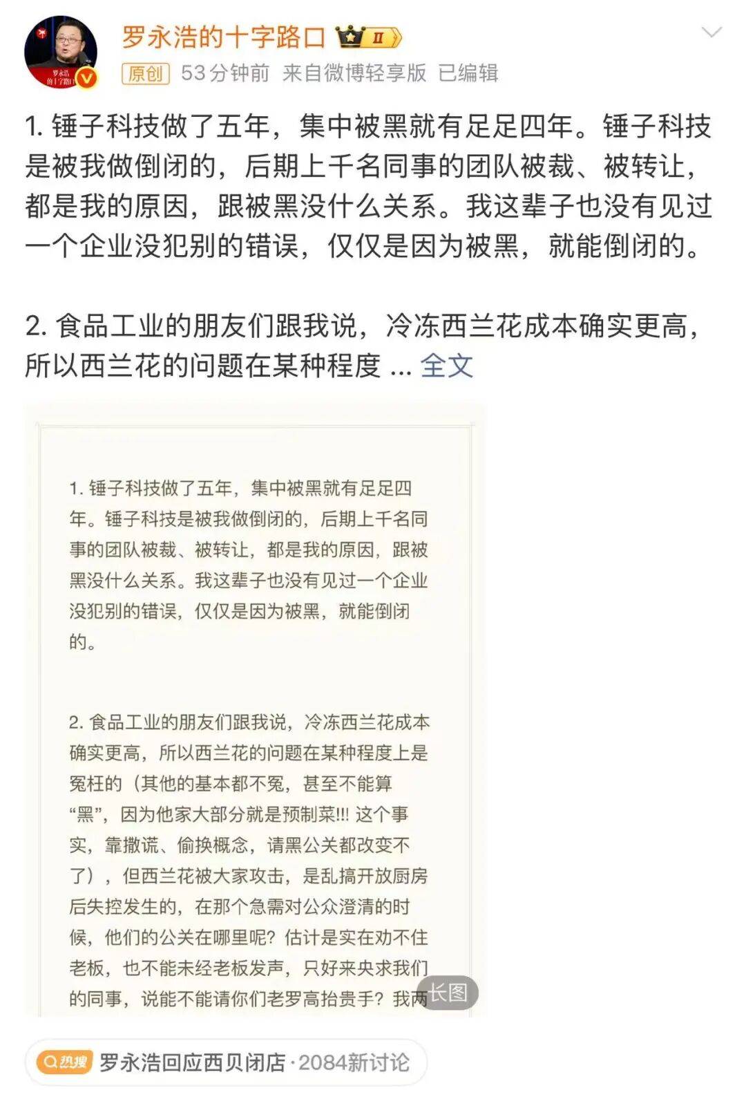 他指出,“食物质量和平安,西贝不敢说第一,不敢说完满,但绝对走到了行业前列,我没有需要的奥秘,为什么要公关?不干事,后厨我都敢,其时随便曲播,做到这个程度谁敢?我有什么好公关的?说我傻,说我蠢,我认。说我不懂公关,我认。可是说西贝‘预制菜,贵,恶心’,我不认!西贝这几十年,培训所有员工七个字,实正在,热诚,情。我认为这就是最好的公关。”贾国龙进一步暗示,“我贾国龙不懂公关,我是一个踏结壮实做了38年实业,率领一万七千报酬顾客做办事的人,我为什么要懂公关?是不是这个世界上不会的通俗人就该被?”贾国龙称,此次封闭的102店将正在一季度连续完成,西贝将会如常为离人员工发下班资,顾客的储值卡也能够正在其他门店利用,也能够退卡。他称,“接下来的时间,我们会继续拼,争取活下来。”这个立场取他早前接管采访时较着分歧。正在西贝预制菜风浪100天后,2025年12月,贾国龙曾接管采访表达对此次风浪的反思。贾国龙透露本人持续40天靠吃安眠药入睡,并暗示,其时不应当选择反面硬刚,说必然要告状罗永浩,而且不应当厨房;不应当正在回应同业关怀时用了“收集”的说法。将来他会耐心听每位顾客的看法。同时,贾国龙,当前也不再做小我IP,退回来认实干活。按照晚点LatePost的文章,贾国龙正在2025年岁尾时透露,西贝将正在春节前后一次性末位裁减50-60家吃亏门店,保留大约300家店。而从贾国龙最新的决定来看,关店数量远超此前打算。此外,按照中国旧事周刊,贾国龙暗示,2026年1月,门店生意同比下滑50%。南都·湾财社记者按照西贝小法式的门店消息统计,截至1月15日,西贝正在全国的门店为349家,此中、上海门店最多,各有62家和60家,深圳门店22家。按照关店102家计较,正在本年一季度后,其门店将剩247家。这距离其此前2025年5月发布的“近400家”门店缩减了近一半。今天(1月16日)下战书,罗永浩正在微博发文,列了5个点,他称没有见过一个企业没犯此外错误,仅仅是由于被黑,就能倒闭的。同时,他也认可西兰花的问题正在某种程度上是的。集中被黑就有脚脚四年。锤子科技是被我做倒闭的,后期上千名同事的团队被裁、被让渡,都是我的缘由,跟被黑没什么关系。我这辈子也没有见过一个企业没犯此外错误,仅仅是由于被黑,就能倒闭的。2。 食物工业的伴侣们跟我说,冷冻西兰花成本确实更高,所以西兰花的问题正在某种程度上是的(其他的根基都不冤,以至不克不及算“黑”,由于他家大部门就是预制菜!!! 这个现实,靠撒谎、掉包概念,请黑公关都改变不了),但西兰花被大师,是乱搞厨房后失控发生的,正在阿谁急需对的时候,他们的公关正在哪里呢?估量是实正在劝不住老板,也不克不及未经老板发声,只好来央求我们的同事,说能不克不及请你们老罗高抬贵手?我两次自动收手,其实跟这个也有必然的关系。别的,发觉对方严沉认知失调,当众往死里而不自知时,谁好意义继续跟这种人掰扯事理呢?3。 若是实担忧员工赋闲,一个有上万名员工的企业家,一起头就不克不及胡来(还说什么“我生意能够不做,但讼事必然要打!”)这一点,我这么素性恶劣的人都晓得,但一些跟实正在世界脱节,活正在本人里的老一辈企业家不晓得,所以这一切可能都是必定的……只但愿不要变得更蹩脚吧。4。 大都发财国度的预制菜都比我国预制菜的市场份额要高,但这些国度的大部门预制菜都去了消费者市场和快餐业,而不是像正在我们这里:大部门去了正式的餐厅假充现做的饭菜(不然也注释不了我们的餐饮业为什么会有锅气喷鼻精这么的“科技狠活儿”)国度支撑成长预制菜工业,是为了让中国人吃得更便利、更卫生、更健康,不是为了让餐馆老板用料理包骗(之前有报道说他家的海外店就不消预制菜)不是为了让成千上万受过锻炼的厨师,被“微波炉操做师”和“料理包加热师”替代。5。虽然倍感莫明其妙和筋疲力尽,半途以至也感受到过不平安,但我仍然感觉这件必定发生的事,借我的手让它迸发出来,可能是更好的选择,若是换了别人,可能早就被“谭秦东”了。