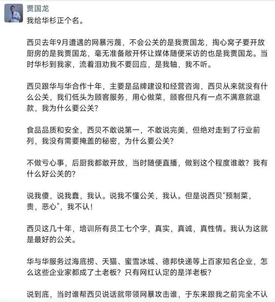 昨晚(1月15日),贾国龙发布伴侣圈称,西贝客岁9月的“网暴”,不会公关的是他本人,厨房、敞接管采访也都是他本人的决定,贾国龙指出,西贝跟华取华合做十年,次要是品牌扶植和运营征询,他质疑称,“华取华办事过海底捞、天猫、蜜雪冰城、德邦快递等上百家出名企业,怎样这些企业家都成了土老板?只要网红认定的是洋老板?”