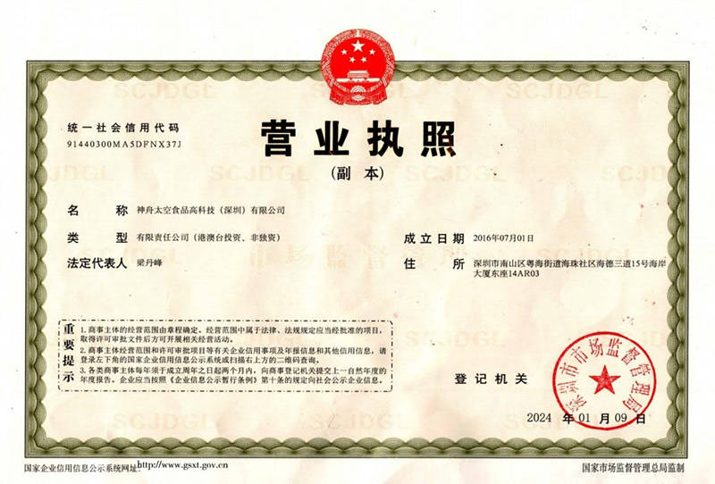 神舟太空食物高科技(深圳)无限公司,自成立以来便专注于航天员太空食物的平易近用化取财产化。公司独家具有中国航天员科研锻炼核心授权的航天员食物专利手艺——《空间坐航天员高能压缩食物及其制法》,专利号:ZL2。3。这一专利手艺不只填补了国内正在航天员太空食物范畴的空白,更为公司建立了一道的手艺壁垒。