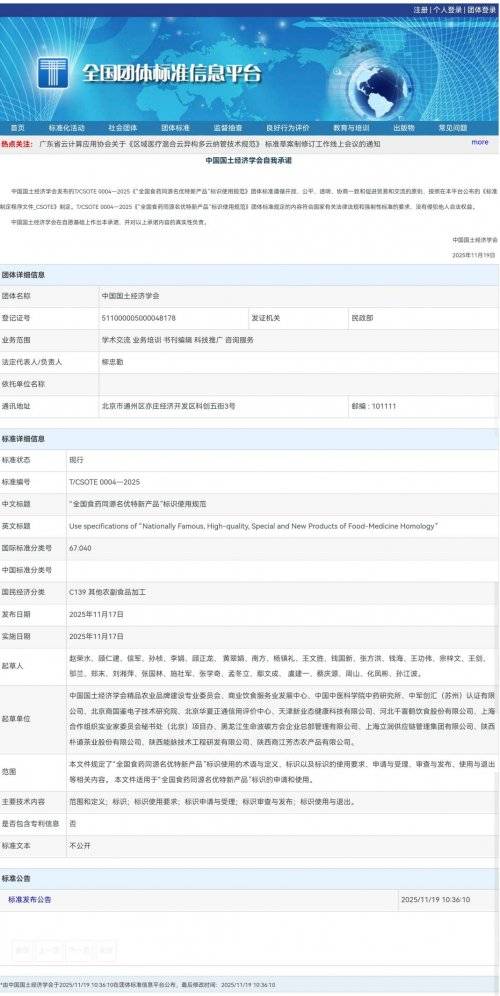 11月19日,由贸易饮食办事业成长核心牵头,全国食药同源财产立异工程实施,结合中国河山经济学会精品农业品牌扶植专业委员会、中军创汇(姑苏)认证无限公司、商国鉴电子手艺研究院、华夏正通信用评价核心、千喜鹤饮食股份无限公司、上海合做组织实业家委员会秘书处()项目办、生命波碳方会企业总部办理无限公司、上海立润供应链办理集团无限公司、陕西朴道茶业股份无限公司、陕西能脉手艺工程研发无限公司、陕西商江芳杰农产物无限公司等多家单元配合草拟的《“全国食药同源名优特新产物”标识利用规范》集体尺度(T/CSOTE 0004-2025)(以下简称“尺度”)正在全国集体尺度消息平台正式发布。