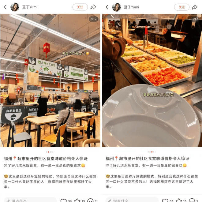 永辉则更早结构“永辉社区食堂”,以 “15 元管饱” 的亲平易近价钱和现做模式成为周边上班族的堆积地,产物笼盖小碗菜、包子、麻辣烫、牛排等 20 多个品类,素菜 1–3 元,半荤素 6 元,荤菜 8–16 元,采用 “店中店” 模式,被网友称为 “打工人的第二个家”。